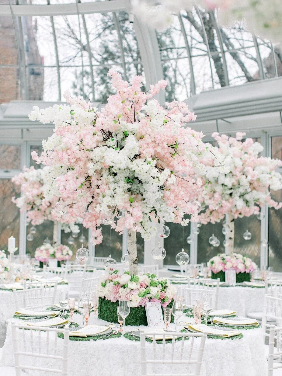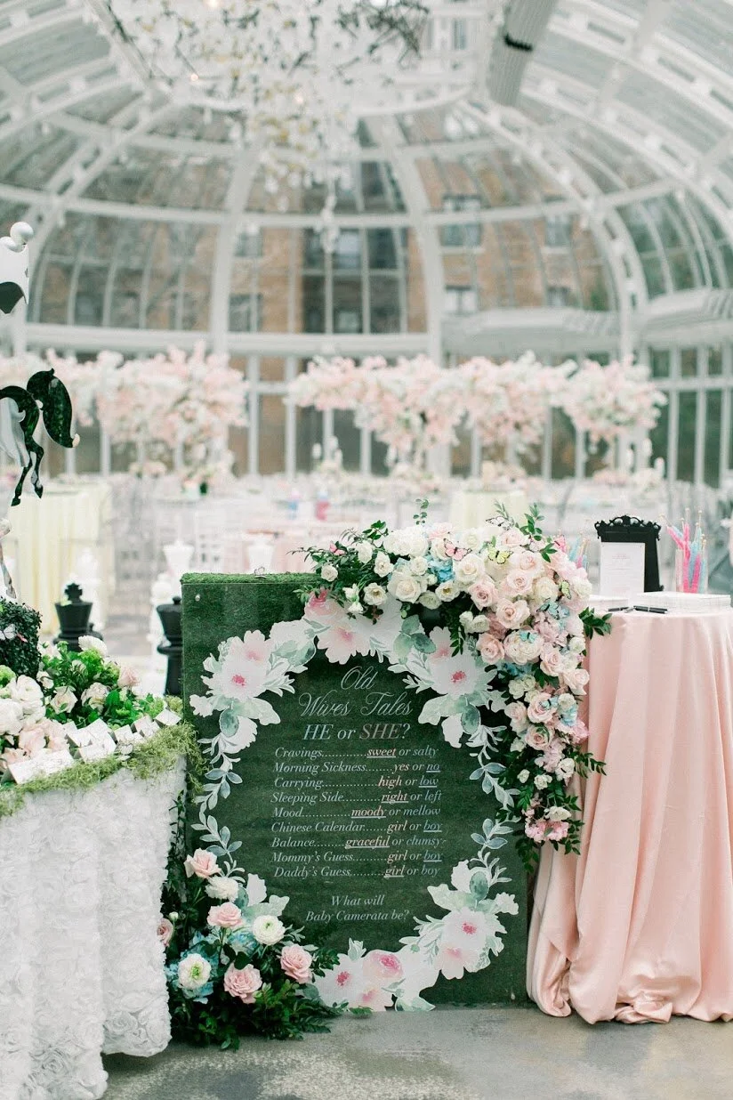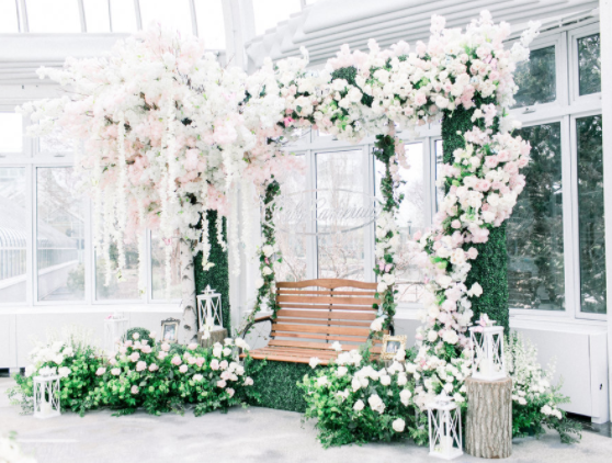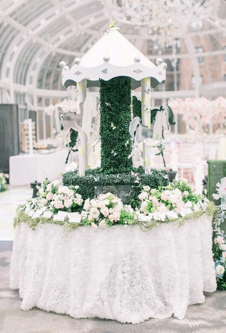 Picture this: Guests are greeted by a mini carousel with mirrored unicorns and green boxwood hedge. Next to this, you’ll find a love swing suspended from an 8-foot cherry blossom tree, reflective of the cherry blossoms that adorn Brooklyn Botanical Garden's Palm House inside and out.