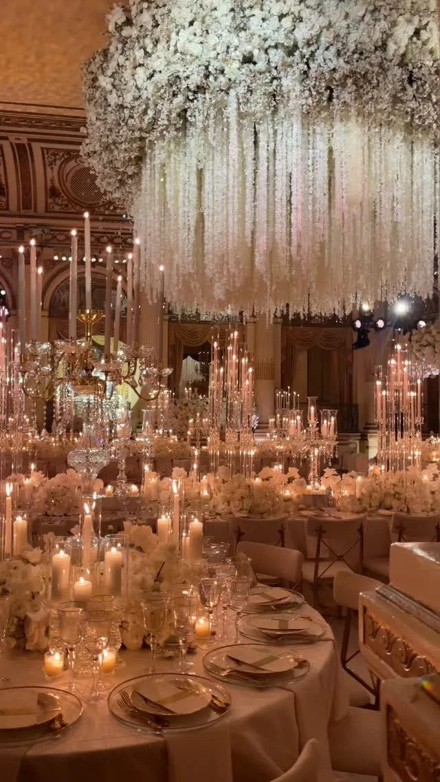We chose to incorporate white and blue hydrangeas throughout the entire look to create a classic, Southampton, Montauk vibe. In order to enforce a cohesive look, we used miniature blue and white vases and beautiful china urns to hold the hydrangea and white roses. In order for us to have a different, yet impactful 2nd look for dinner, we kept the blue and white hydrangea but added 3 tiers of candle clusters along the center of the table. As the sun set, the candles illuminated the entire table and created an insanely gorgeous backdrop.